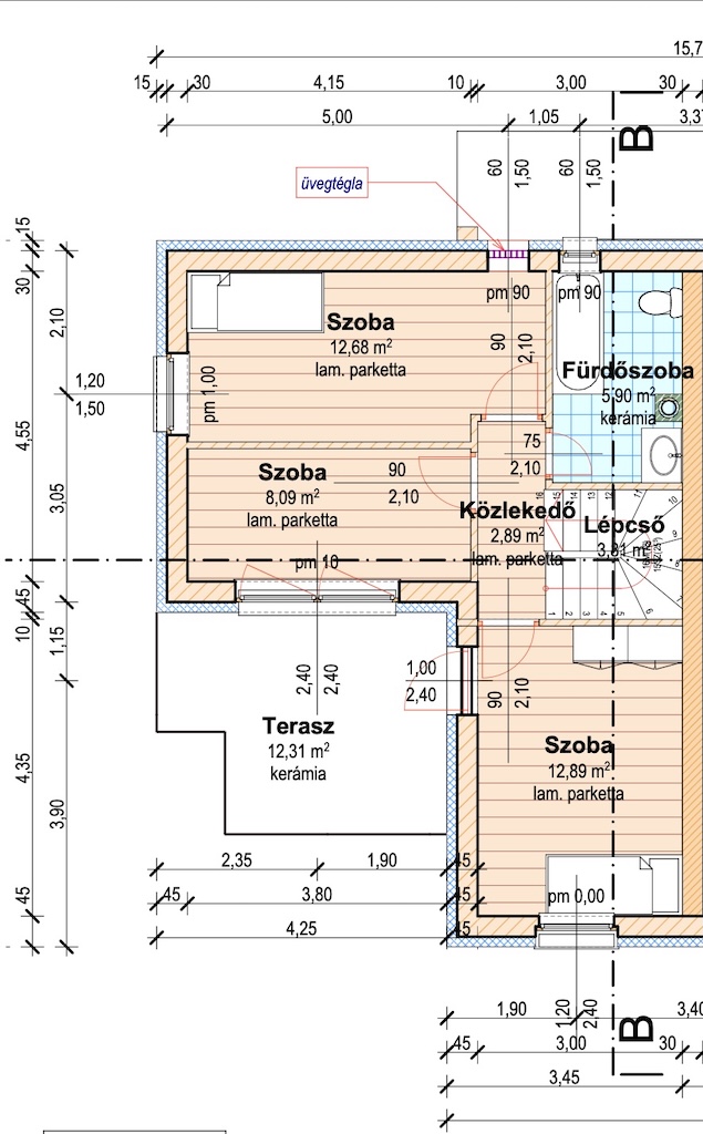 Az emeleten található: 3 szoba, melyikből 2 terasz kapcsolatos, fürdő-WC.