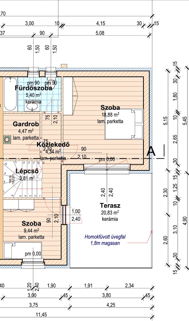 Az emeleten található: 2 szoba, terasszal, fürdő-WC.
