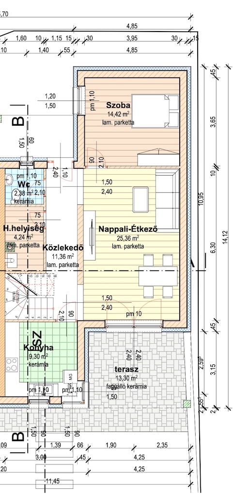 A földszinten található: konyha-nappali-étkező, 1 szoba, háztartási helység, WC, terasz.