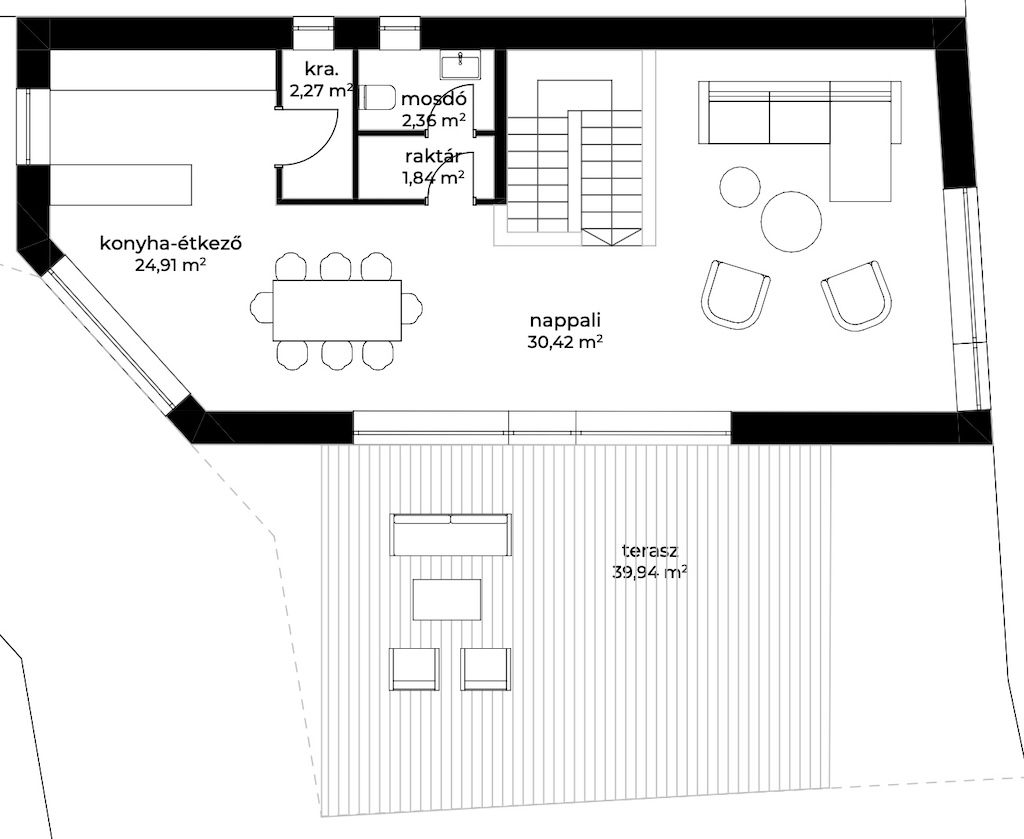 Az emeleten található: konyha-étkező-nappali, kamra, mosdó, terasz.