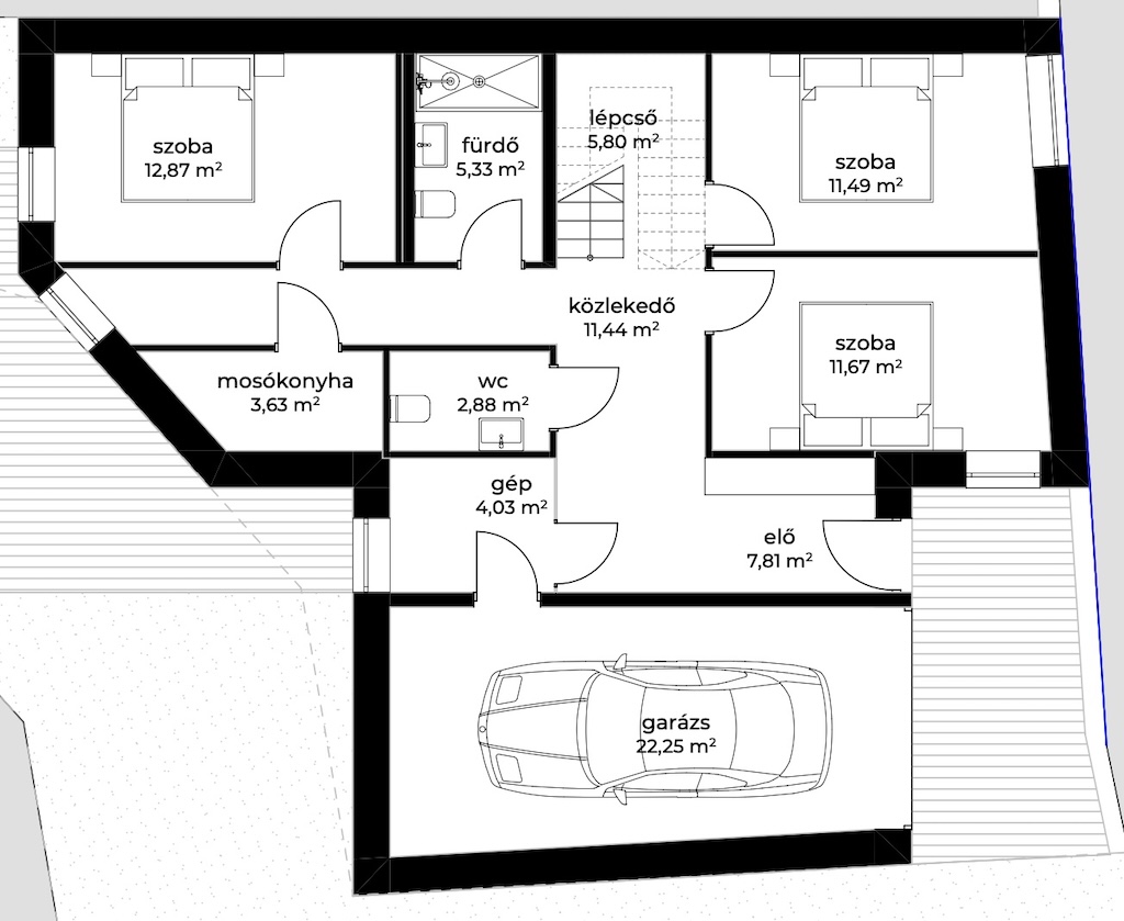 A földszinten található: 3 szoba, fürdő, 2 WC, mosókonyha, gépészet, előszoba, garázs.