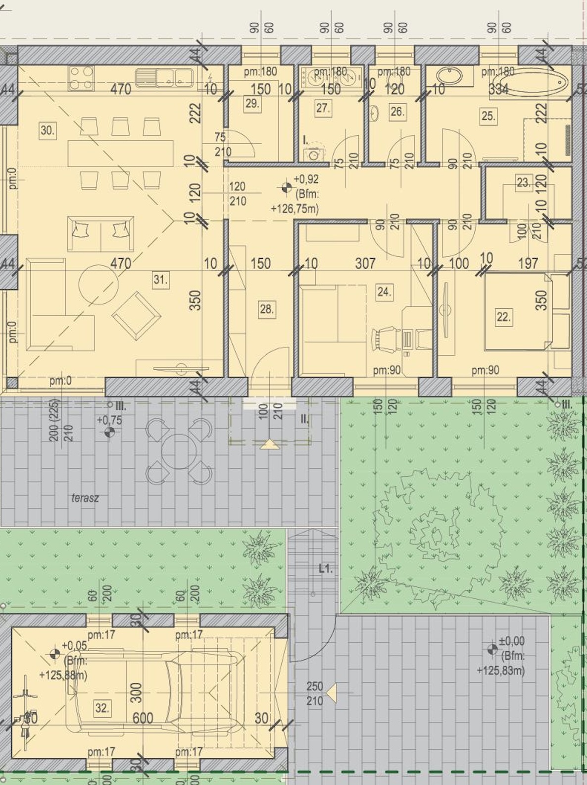 A 86 nm-es lakáshoz tartozik: garázs (18 nm) terasz (23,4 nm), zöldterület 298 nm).